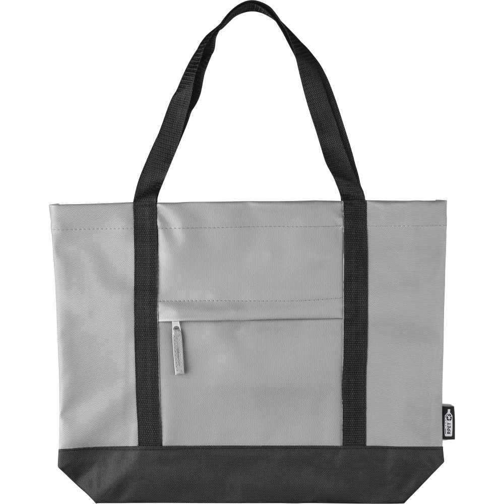 600D rPET poliészter bevásárlótáska. Mindkét oldalon PU bevonat teszi vízlepergetővé. Első cipzáras zsebbel, kicsi, belső cipzáras zsebbel és hosszú hordozófüllel. Kapacitása 10 liter. Oldalán rPET címkével.