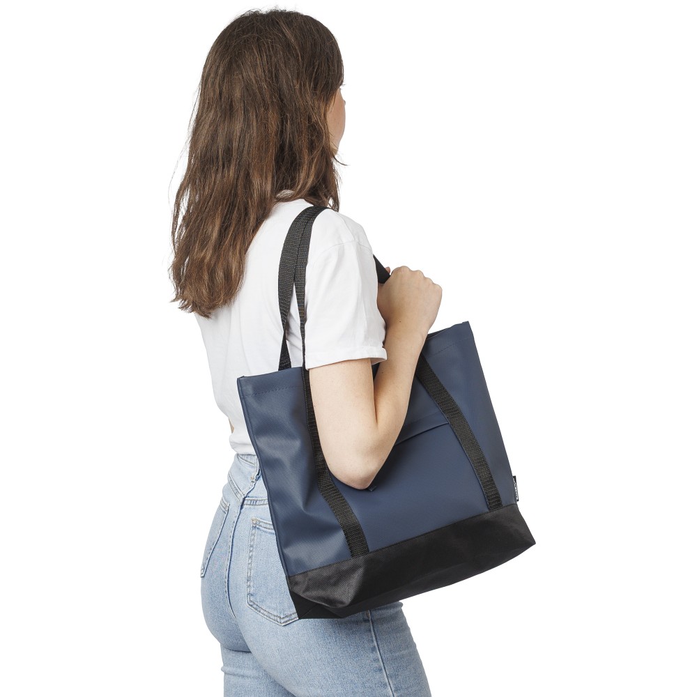 600D rPET poliészter bevásárlótáska. Mindkét oldalon PU bevonat teszi vízlepergetővé. Első cipzáras zsebbel, kicsi, belső cipzáras zsebbel és hosszú hordozófüllel. Kapacitása 10 liter. Oldalán rPET címkével.