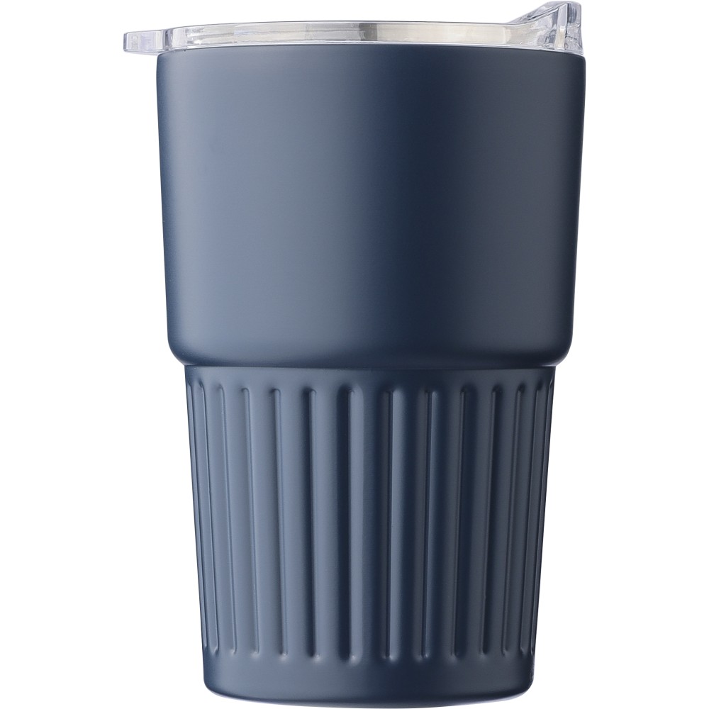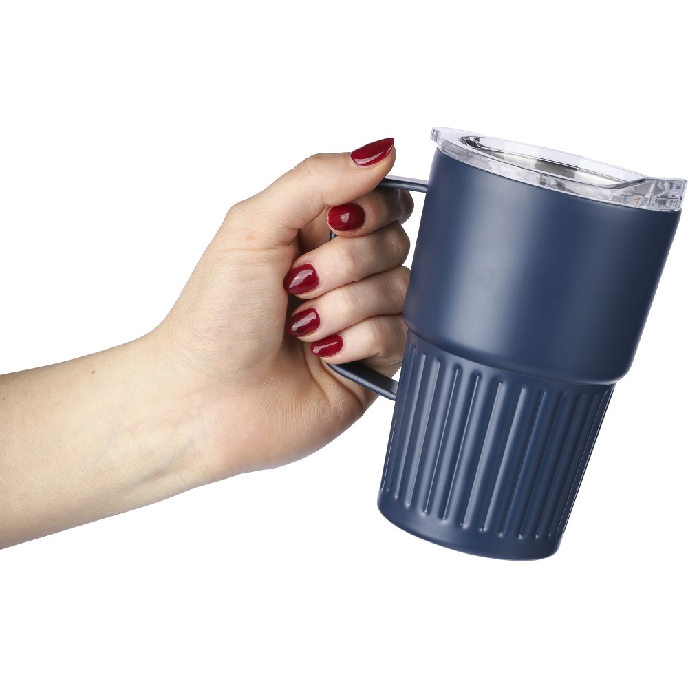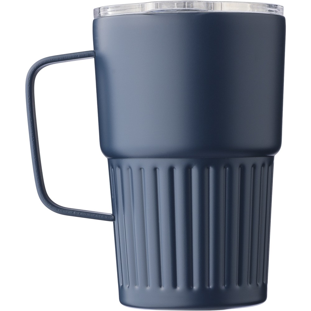 Újrahasznosított rozsdamentes acél útibögre, 450 ml. A belső 304-es, a külső 201-es rozsdamentes acélból készült, bordás markolattal és masszív fogantyúval, műanyag, csúszózáras fedéllel. Gravírozott újrahasznosított logó található a bögrén. Csomagolása barna papírdoboz.