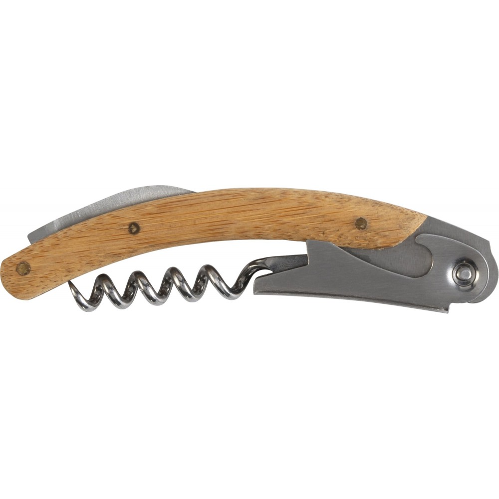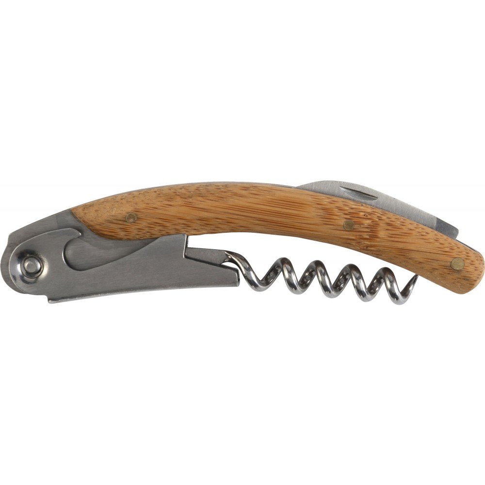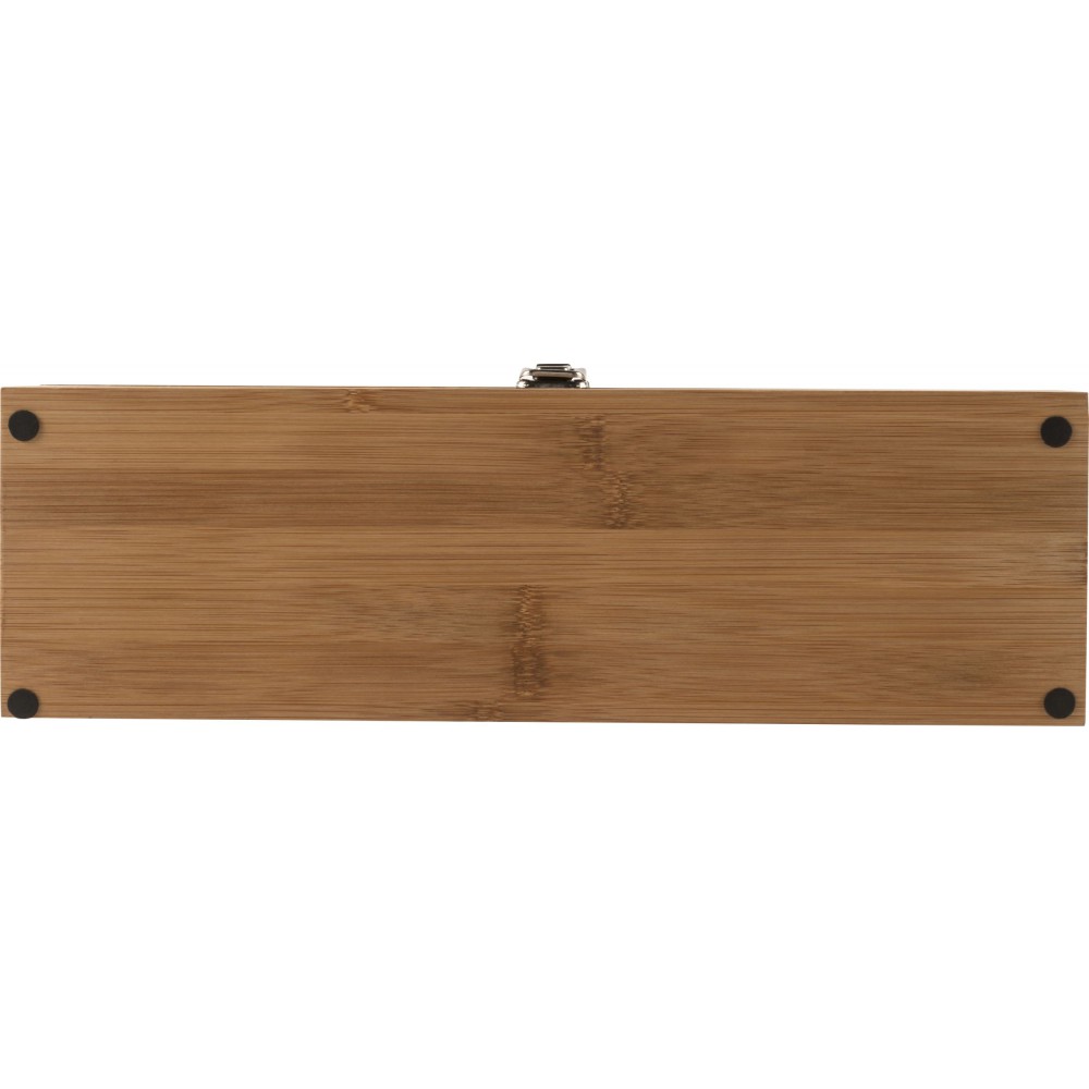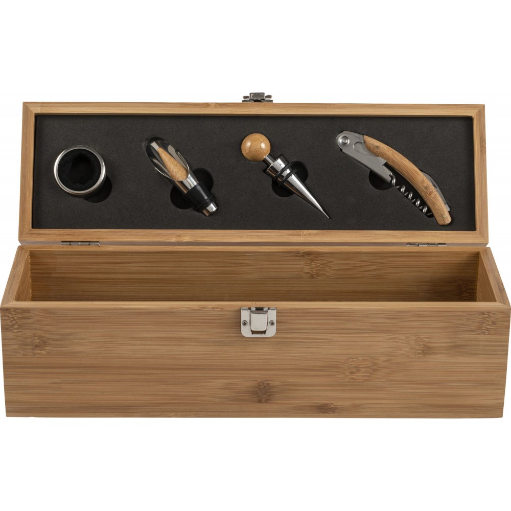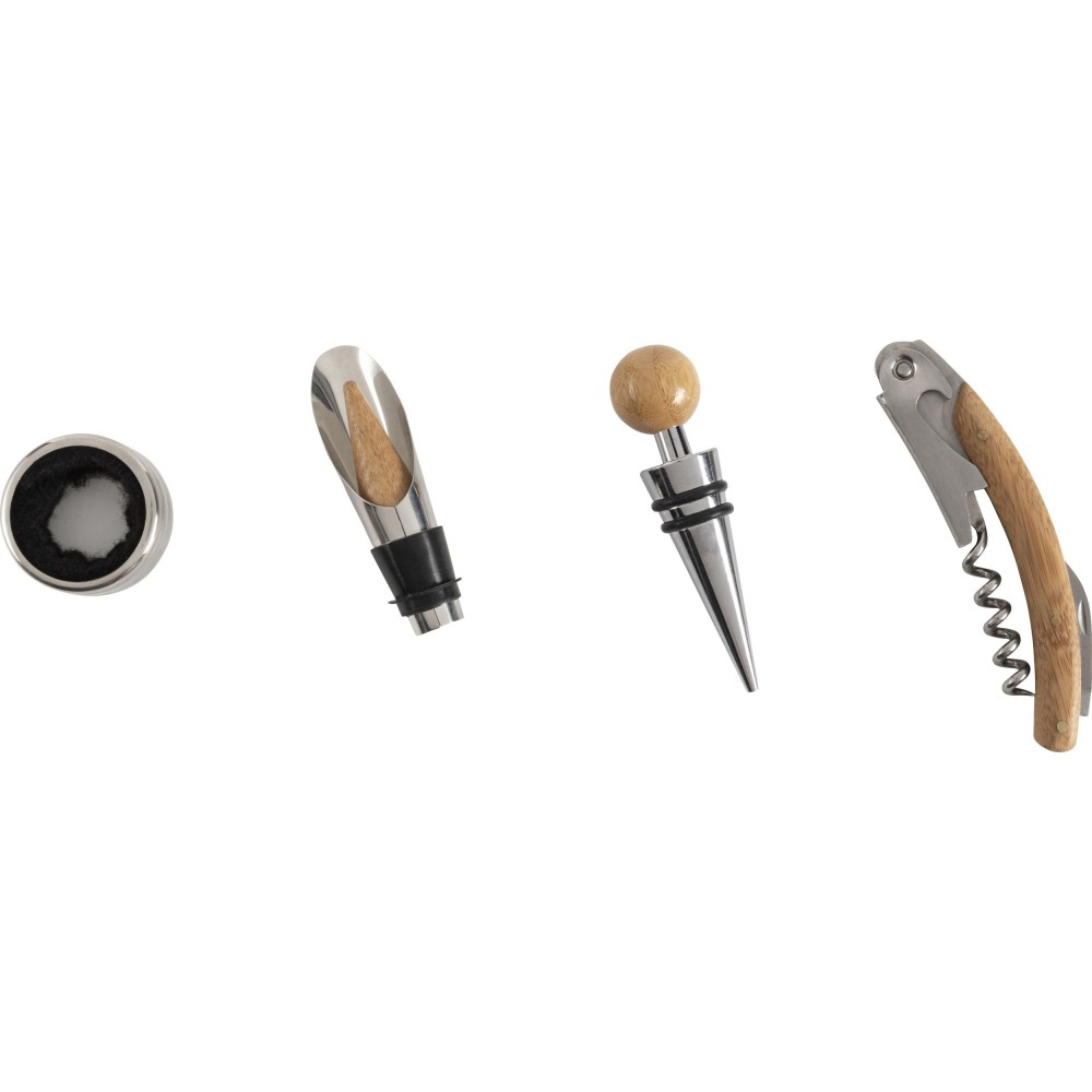 Boros ajándékkészlet bambusz dobozban. A tárgyak rozsdamentes acélból készültek bambusz részekkel. A készlet tartalma: cseppfogó, kiöntő, üvegdugó és pincérbicska. Bambusz és BPA-mentes műanyag.