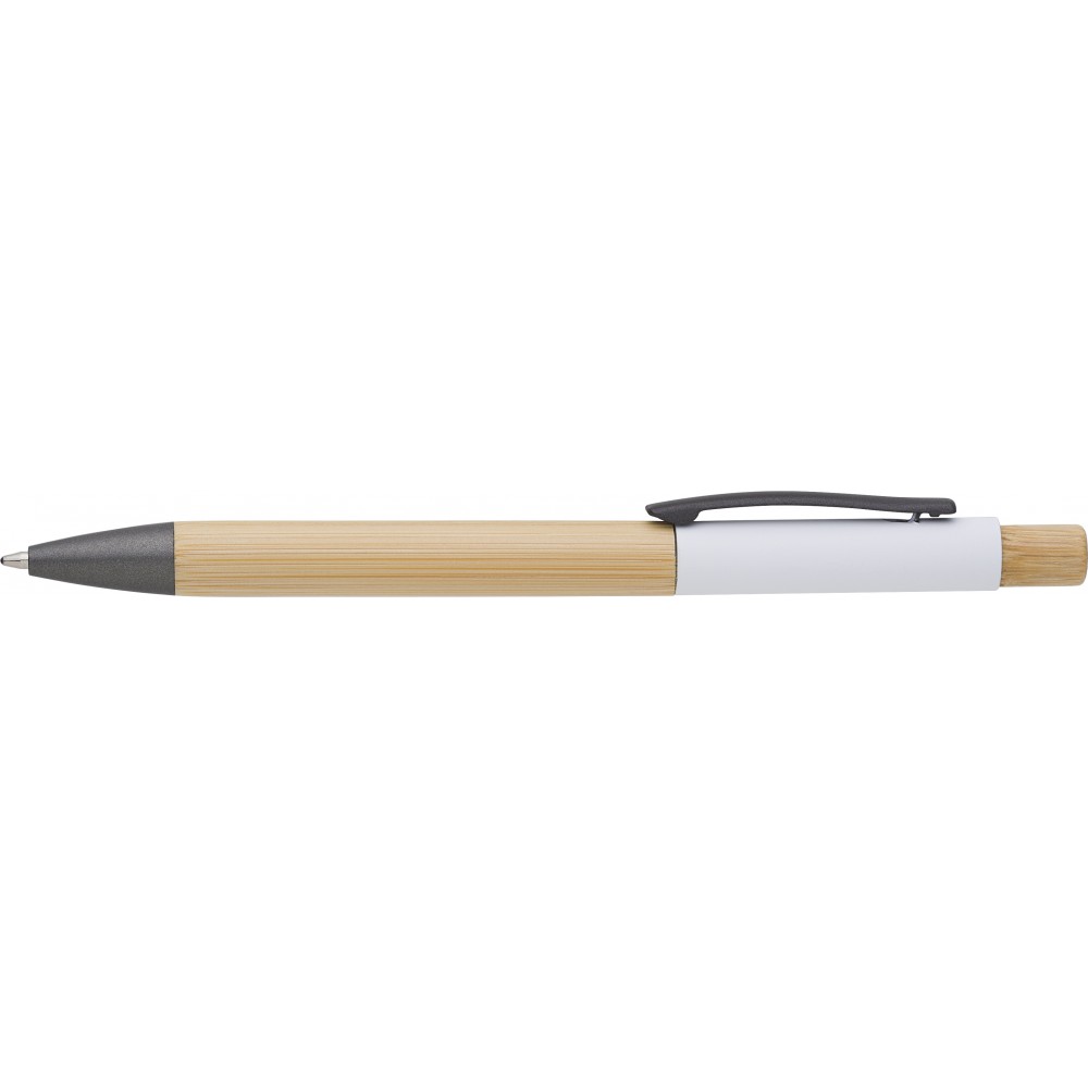 Bambusz golyóstoll alumínium kiegészítőkkel, kék tollbetéttel. Grafit színű hegy és klipsz, bambusz nyomógomb.