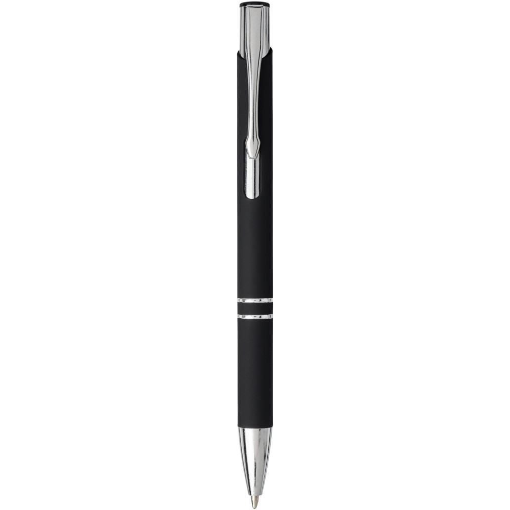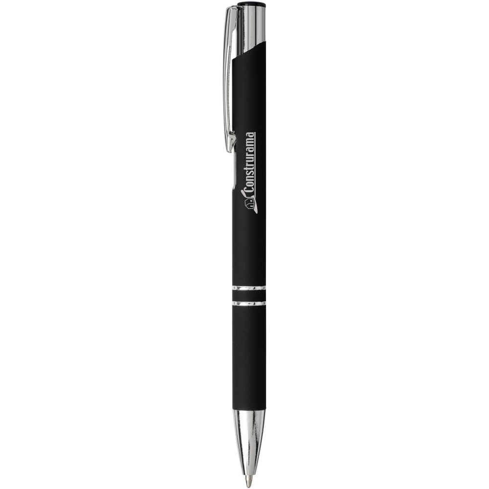 Nyomógombos golyóstoll puha tapintású bevonattal. Lézergravírozáskor megjelenik a toll fényes króm, felület alatti rétege. Fekete tollbetéttel.