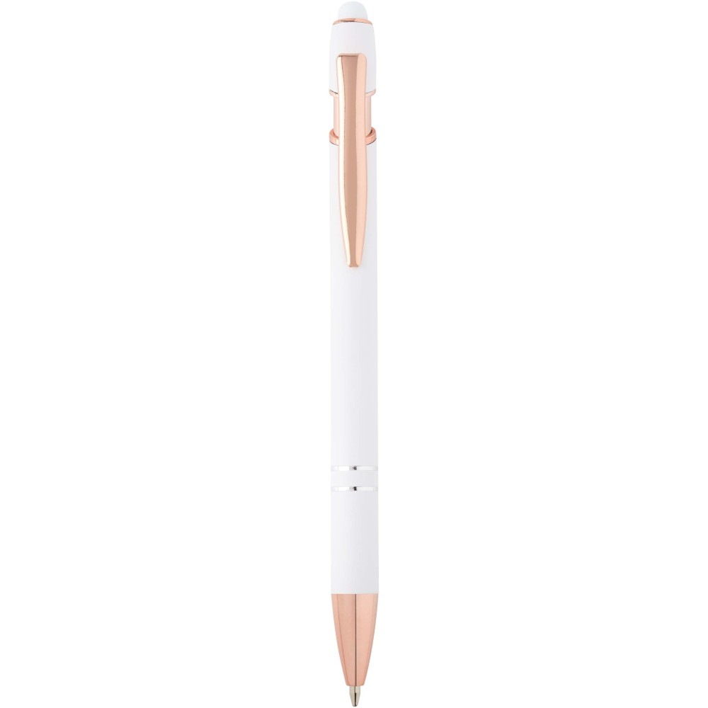 Nanna golyóstoll elegáns rózsaarany színben. A toll teste újrahasznosított alumíniumból, az érintőceruza pedig szilikonból készült, így érintőképernyős eszközökhöz is használható. Az újrahasznosított alumínium csökkenti a hulladéklerakók terhelését, segít megőrizni a természeti erőforrásokat, és célja az üvegházhatású gázok kibocsátásának mérséklése. Tinta színe: kék. Íráshossz: 800 méter. Tollhegy mérete: 1,0 mm.