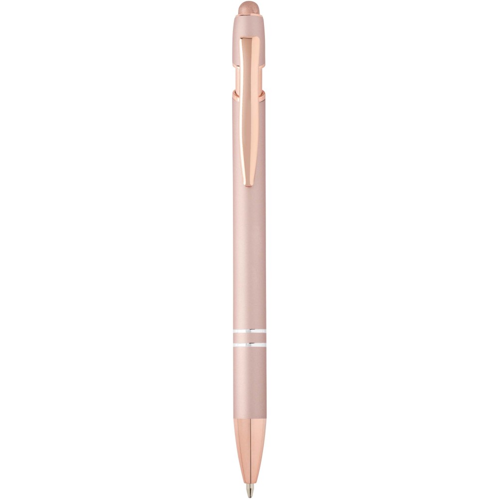 Nanna golyóstoll elegáns rózsaarany színben. A toll teste újrahasznosított alumíniumból, az érintőceruza pedig szilikonból készült, így érintőképernyős eszközökhöz is használható. Az újrahasznosított alumínium csökkenti a hulladéklerakók terhelését, segít megőrizni a természeti erőforrásokat, és célja az üvegházhatású gázok kibocsátásának mérséklése. Tinta színe: kék. Íráshossz: 800 méter. Tollhegy mérete: 1,0 mm.