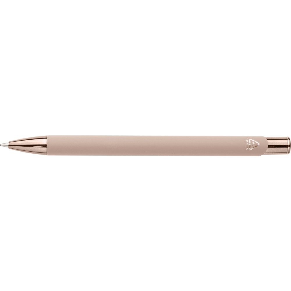 Újrahasznosított alumíniumból készült, gumírozott felületű golyóstoll, a toll színével harmonizáló UV-bevonatú műanyag és fém díszítéssel. Gravírozás után fényes tükörhatás jelenik meg. A tolltesten gravírozott recycled (újrahasznosított) alapanyagra utaló logó található. Megközelítőleg 800 méter íráshosszúságú, kék színű tollbetéttel.