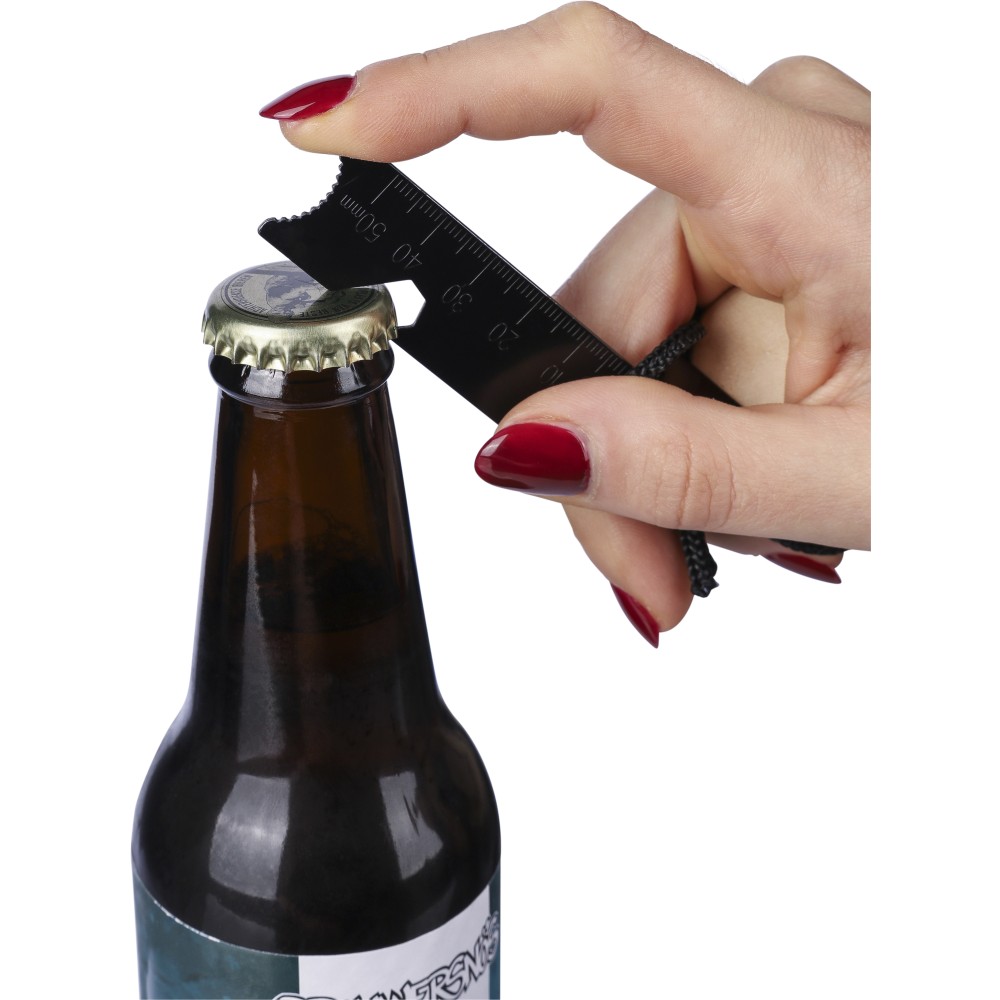 Rozsdamentes acél tűzgyújtó fenyő nyéllel és poliészter pánttal, mely csatlakoztatja a kaparóeszközt és a gyújtópálcát. A multifunkciós kaparóeszköz üvegnyitót, vonalzót és hex-kulcsot tartalmaz. Csomagolása barna papírdoboz.