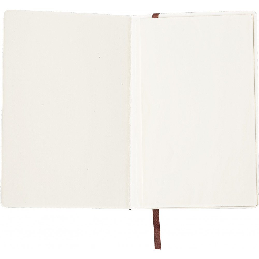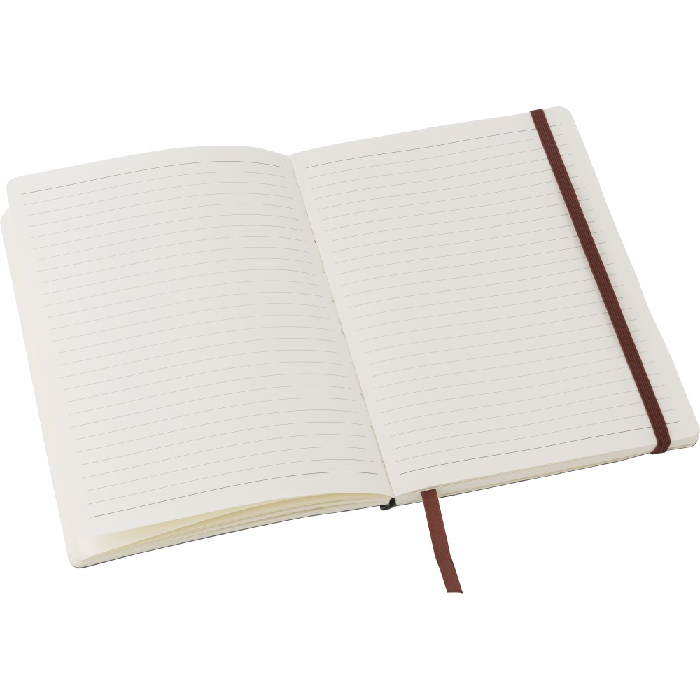 Puhafedelű, hajlékony borítójú füzet 80 vonalas lappal, a borító belsejében zsebbel, gumis záródással és könyvjelzővel. PU.