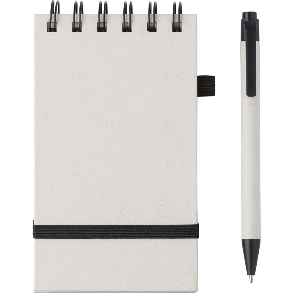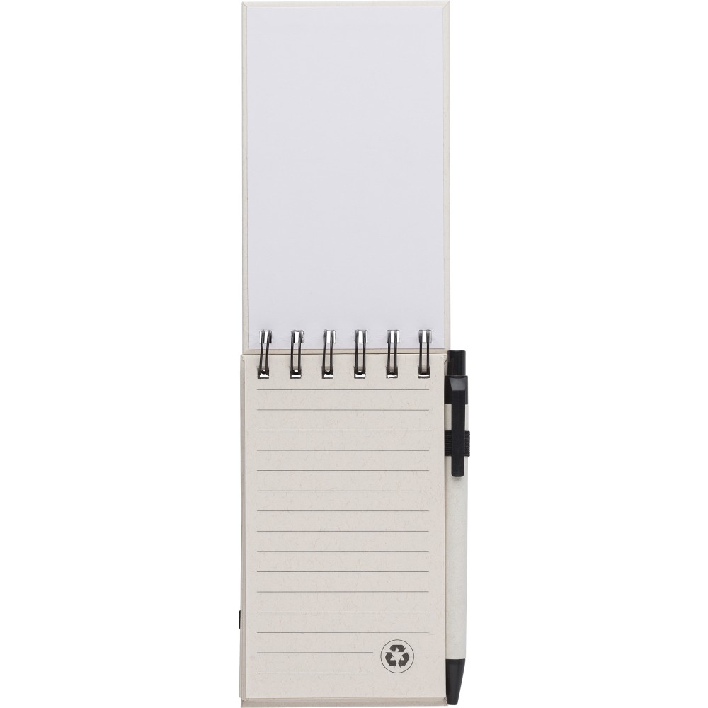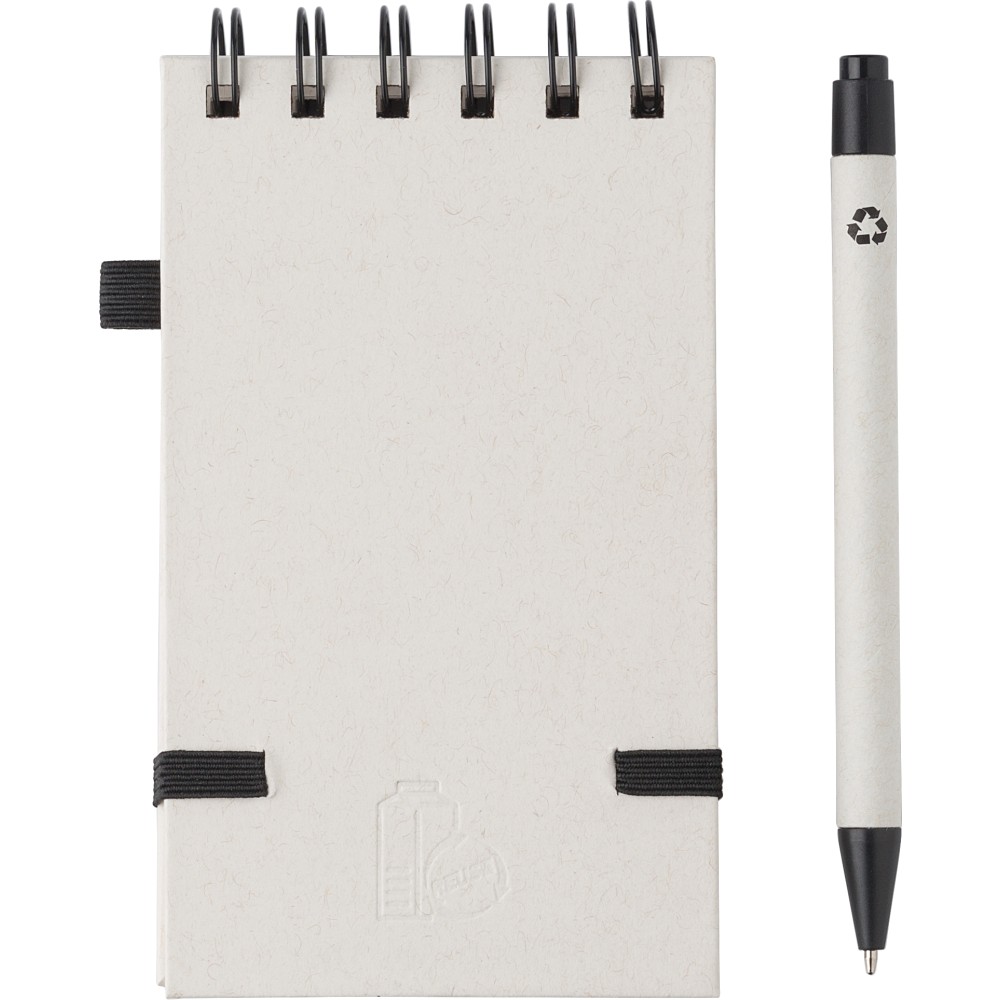 Újrahasznosított tejesdobozból készült A6-os jegyzetfüzet, 70 lappal, gumiszalaggal és tollhurokkal. A toll kék tollbetéttel érkezik. 70%-ban újrahasznosított tejeskartonból és 30%-ban újrahasznosított (sima) papírból készült.