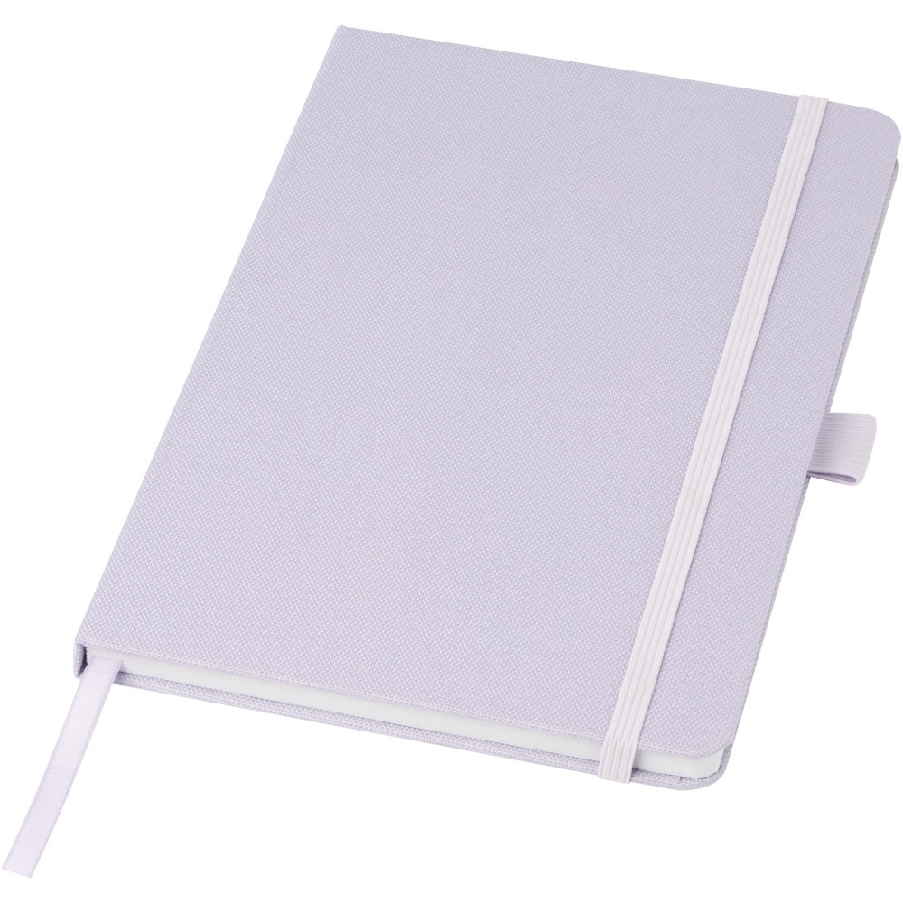 A5 jegyzetfüzet újrahasznosított PET műanyagból készült szövet borítóval. 80 lap 70 g/m2 újrahasznosított, vonalas papír, tolltartó hurok és szalag könyvjelző. Kombinálható a 107757 Honua RPET golyóstollal.