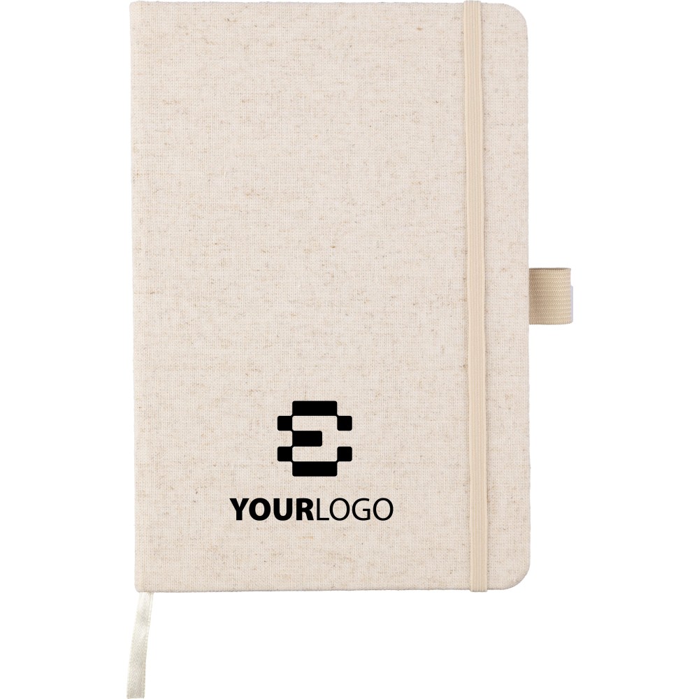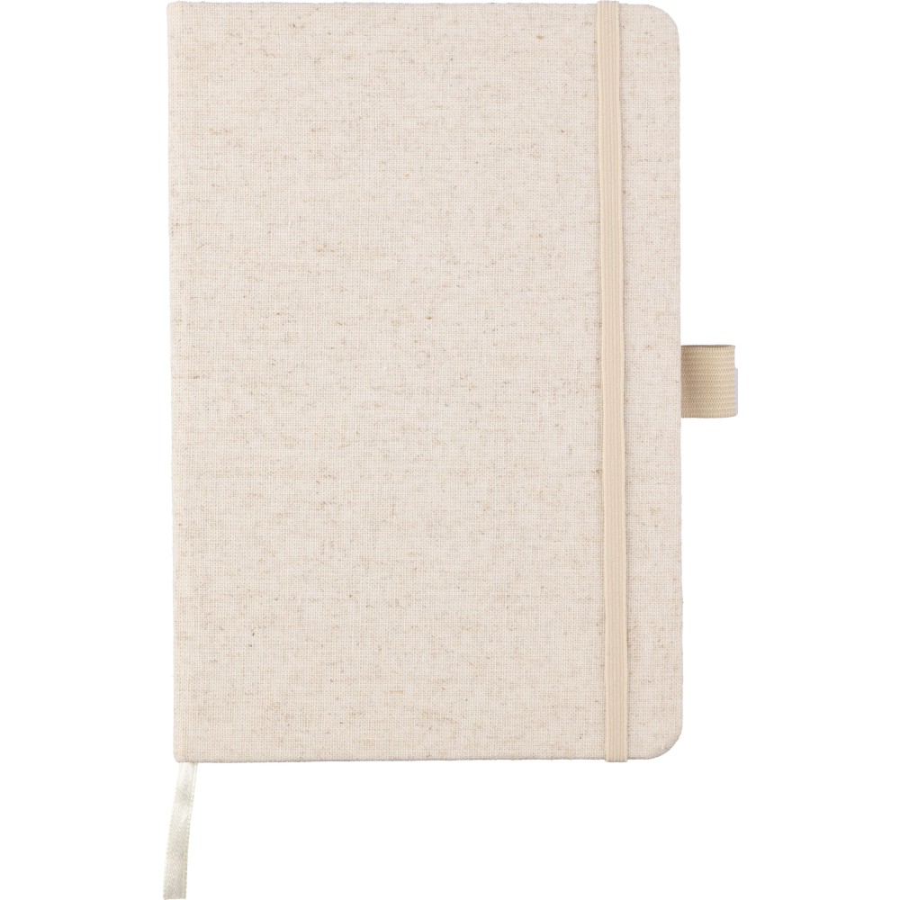 Kenderből készült jegyzetfüzet (kb. A5-ös méret) 80 lappal, tollhurokkal, gumis záródással és hozzáillő natúr színű könyvjelzővel. A borító hátoldalán kender alapanyagot jelző logó.