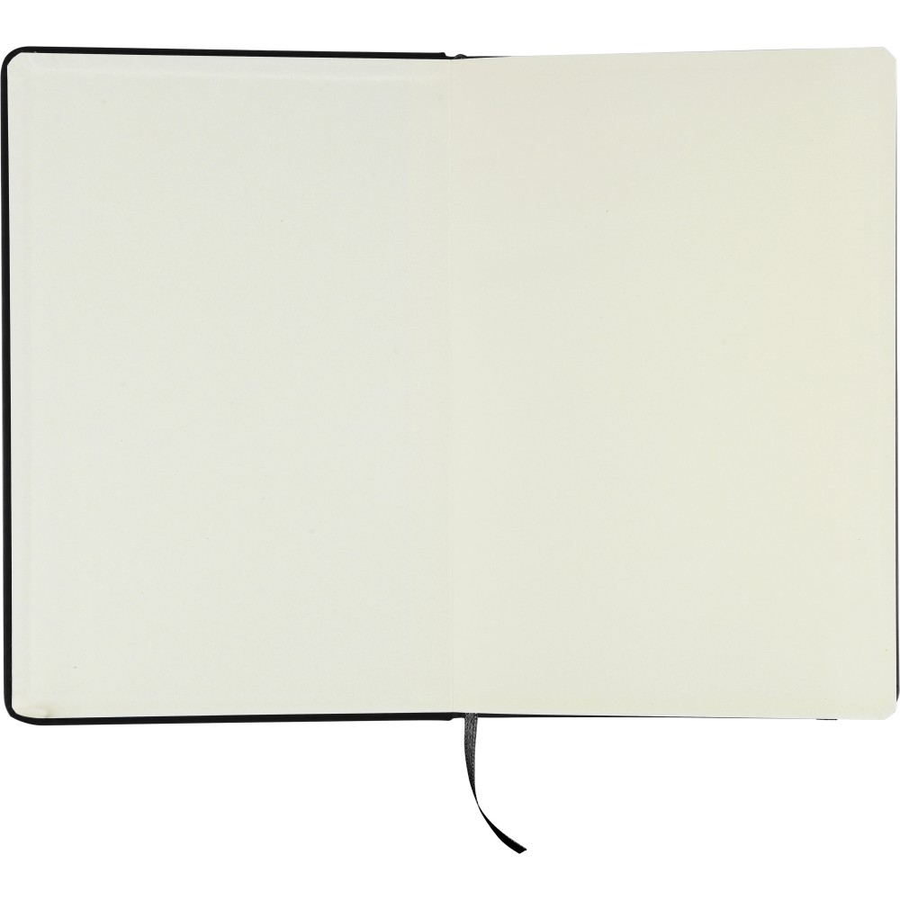A5-ös méretű jegyzetfüzet rPET PU anyagból készült kemény borítóval, 80 vonalas lappal (70g/m2), színben illeszkedő gumipánttal és könyvjelző szalaggal. Az újrahasznosított anyagra utaló dombornyomott logóval a füzet hátoldalán.