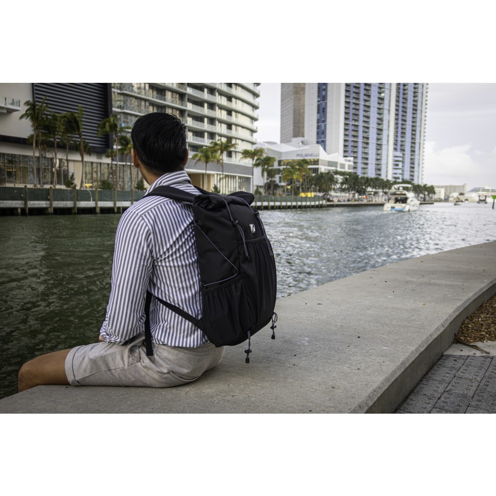A Venturer roll-top hátizsák egyszerre stílusos és környezetbarát kiegészítő, így kiváló céges ajándék. Újrahasznosított PET-palackokból készült, és a fenntarthatóság iránti elkötelezettséget tükrözi, miközben elegáns dizájnt kínál. Tágas fő rekeszében, több sztreccs zsebében és párnázott laptoprekeszében, melyben 16"-es laptop is elfér, bőséges tárolást biztosít a legfontosabb dolgoknak. A könnyű és helytakarékos Venturer ideális ingázáshoz, utazáshoz vagy hétköznapi kirándulásokhoz. Jellemzők: állítható vállpánt, roll-top záródás, szellőző vállpántok, valamint víz- és folttaszító anyag.
