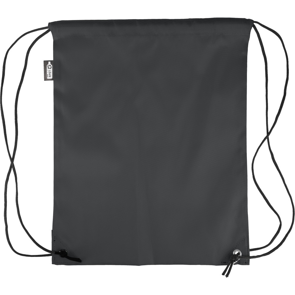 Tornazsák 210D poliészter anyagból, fekete PU sarokerősítéssel az elején, és belső varrással. Fekete nylon húzózsinórral, egy rekesszel. Űrtartalom: 5 liter, teherbíró képesség: 7 kg. rPET címkét tartalmaz.
