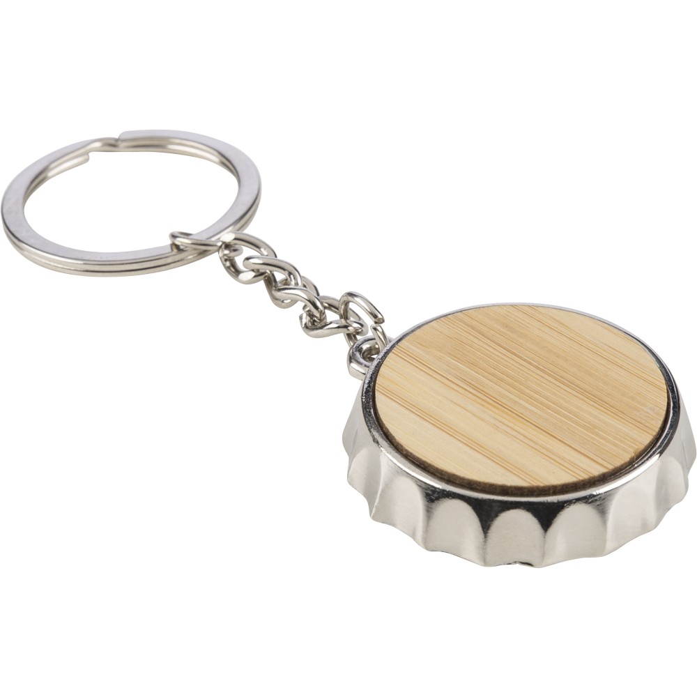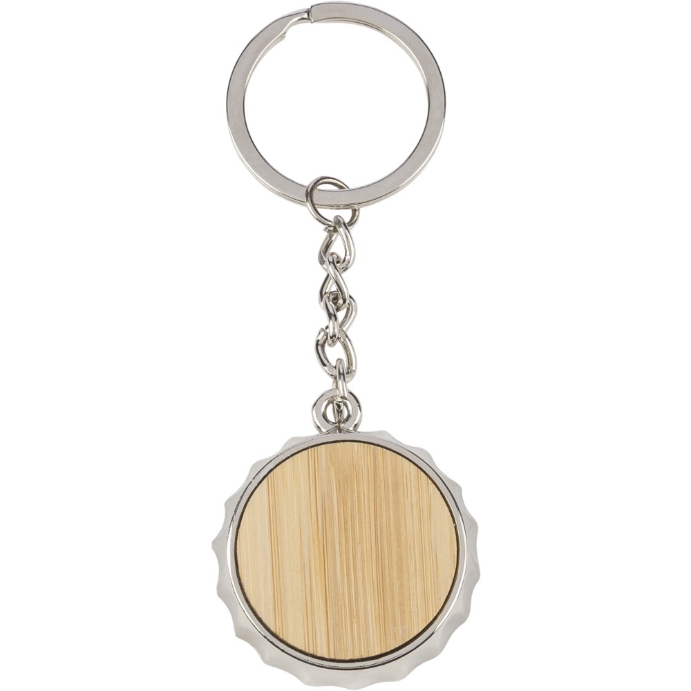 Cinkötvözetből készült kulcstartó elülső oldalán bambusz betéttel, hátoldalán integrált sörnyitó funkcióval, fém kulcskarikával. Papírtasakba csomagolva.