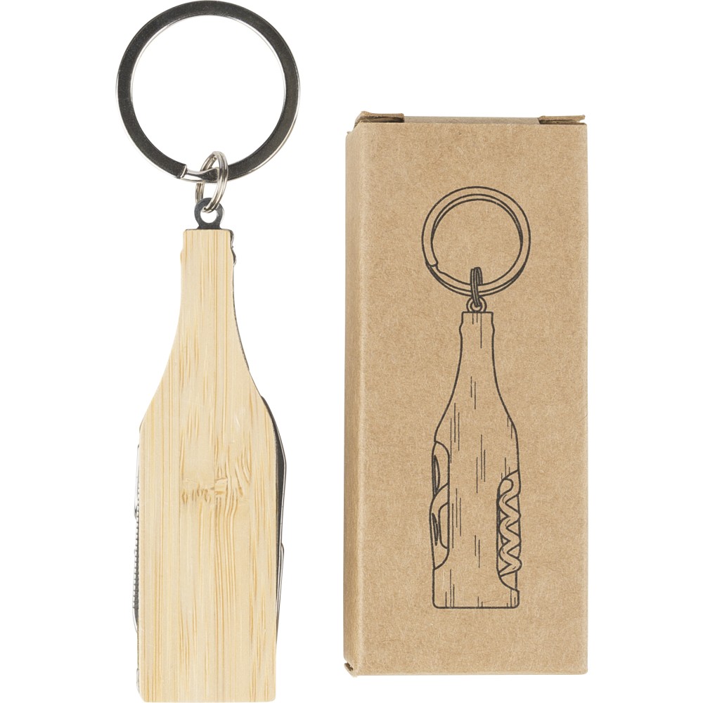 Bambuszból és rozsdamentes acélból készült, palack formájú multifunkciós kulcstartó fém kulcskarikával, dugóhúzóval, körömreszelővel, sörnyitóval és vágókéssel. Egyenként barna kartondobozba csomagolva.