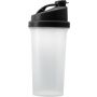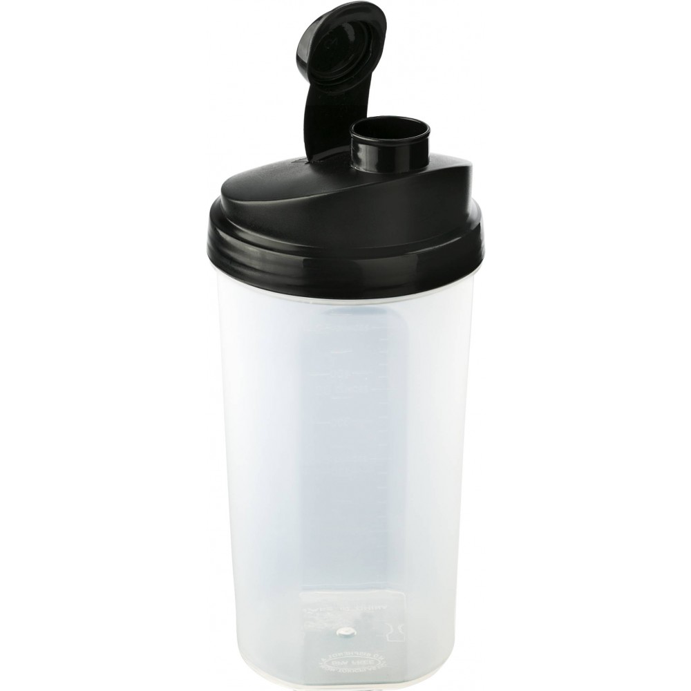 Műanyag protein shaker (kb. 700 ml-es) szűrővel és színes fedéllel, egyik oldalán ml, másik oldalán OZ beosztással. Nem szivárgásmentes. Mosogatógépben nem tisztítható. BPA-mentes műanyag.