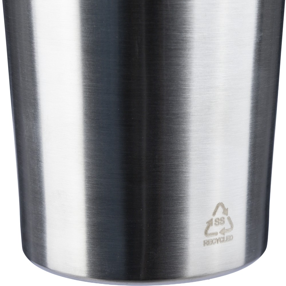 Újrahasznosított rozsdamentes acél sportkulacs, 750 ml-es. Szimplafalú, 304-es rozsdamentes acélból készült. PP csavaros tetővel és fém shakergolyóval a keveréshez. Lézergravírozott újrahasznosított logó az elején. Egyedileg csomagolva kraftpapír dobozban.