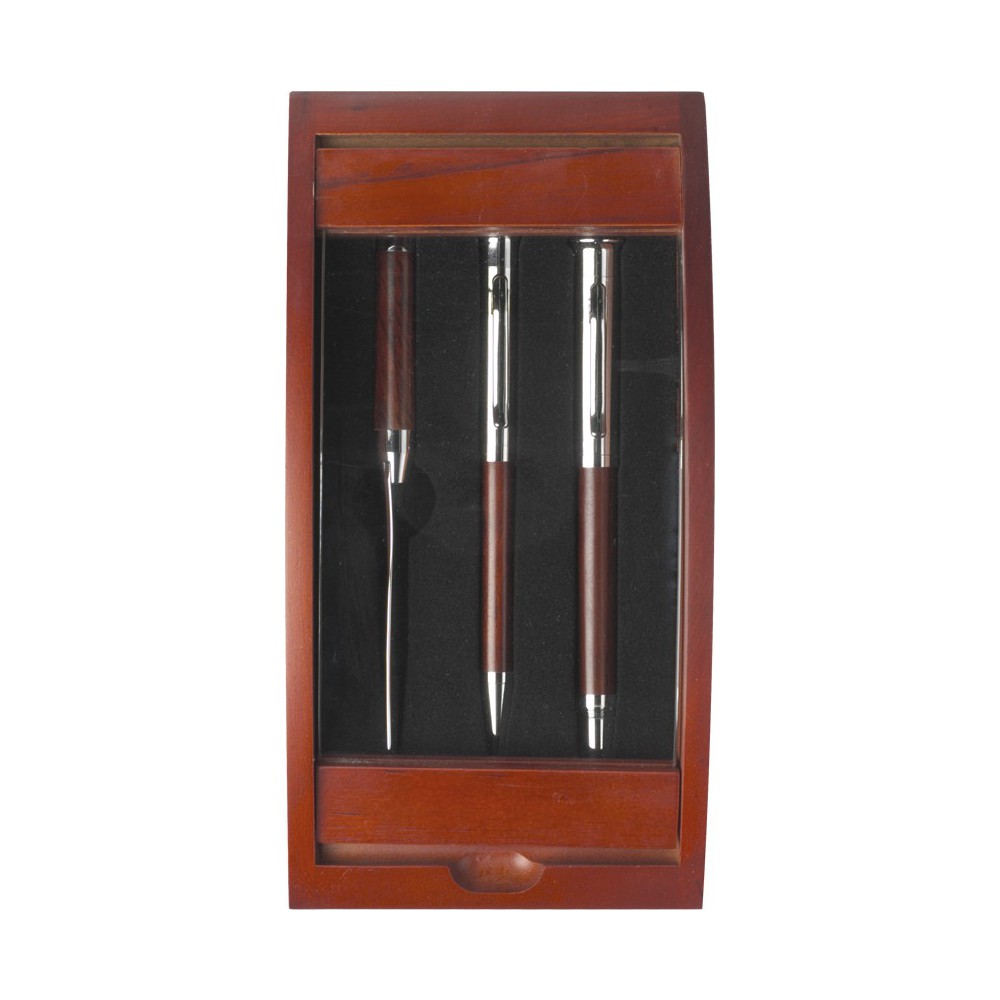 Rózsafa tollkészlet. Levélbontó, töltőtoll és golyóstoll fekete tollbetéttel, átlátszó fedelű díszdobozban.