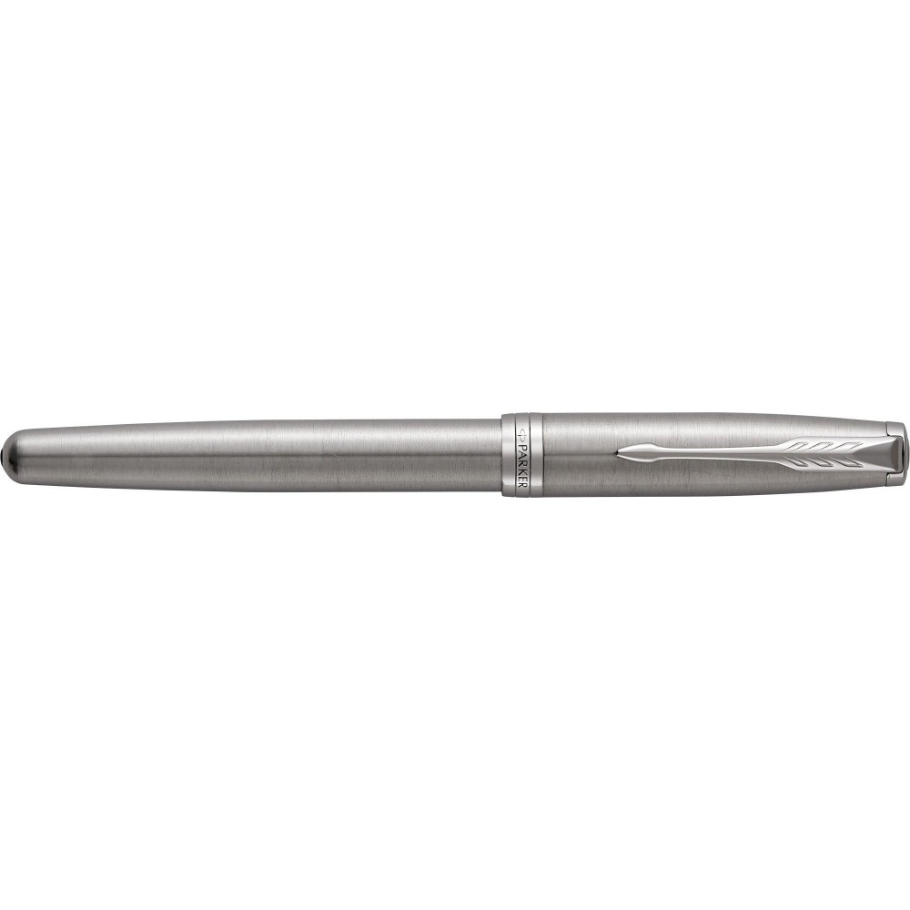 Rozsdamentes acél Parker Sonnet rollerball toll nyomógombos működéssel, fekete tollbetéttel. Csomagolása Parker doboz.