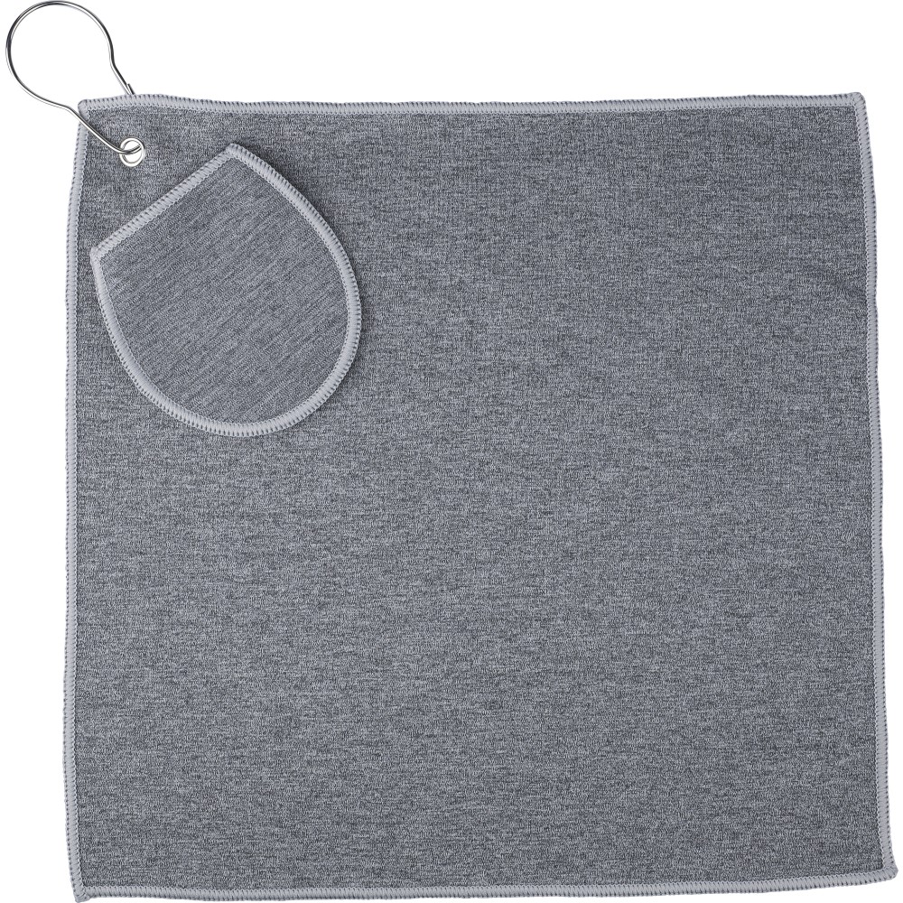 rPET golftörölköző tartozék labdatartó tokkal. A fém kampó segítségével könnyen a táskához csatlakoztatható. Belül rPET címkével. Mosógépben alacsony hőmérsékleten mosható.