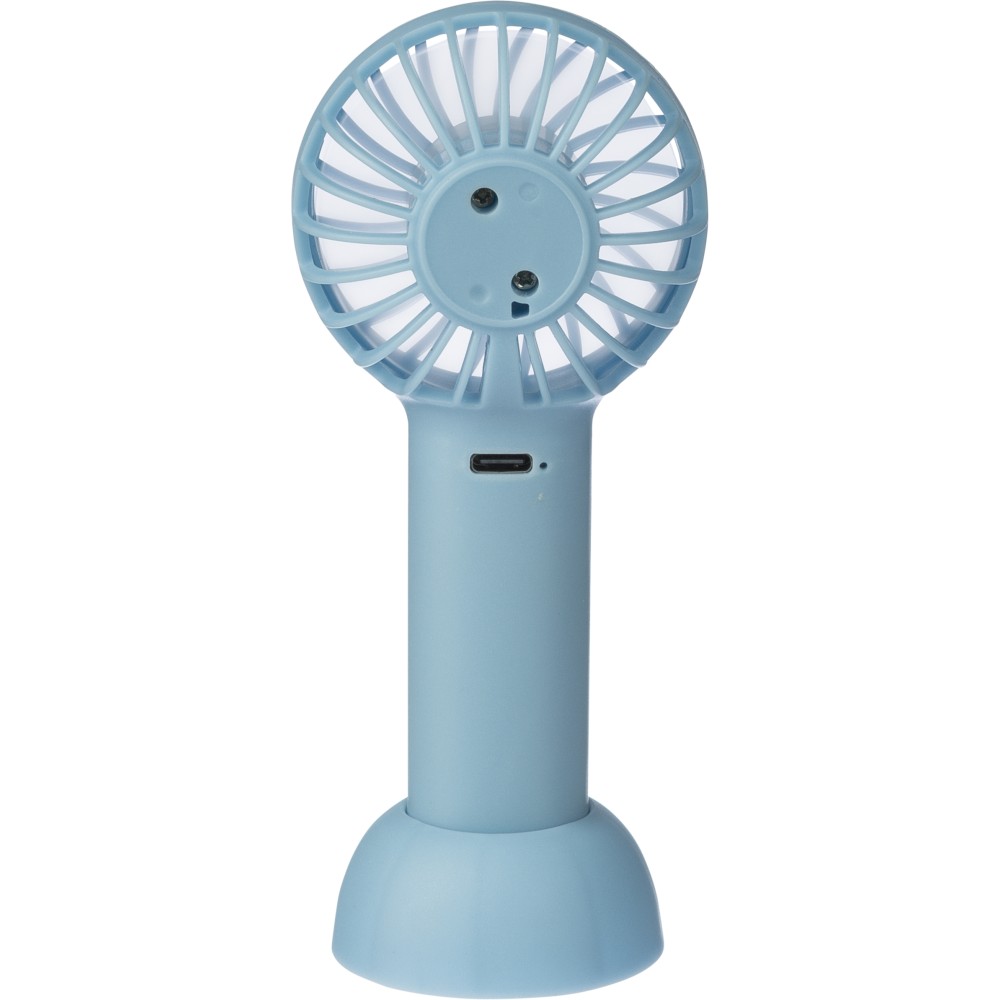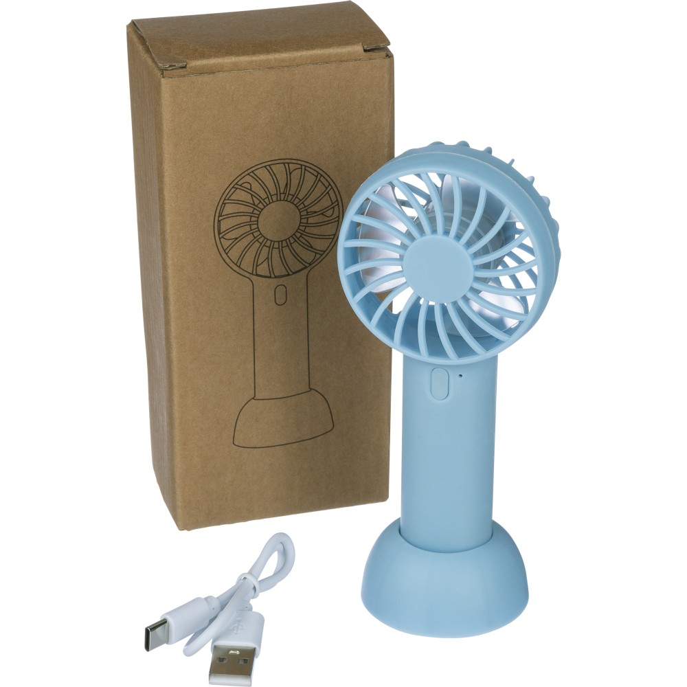 Elektromos kézi ventilátor 600 mAh-s akkumulátorral és C-típusú csatlakozóval és a töltéshez szükséges töltőkábellel. A függőleges használathoz tartozék állvánnyal rendelkezik, de anélkül is használható utazás közben. 3 sebességfokozat. Anyaga ABS. Csomagolása barna papírdoboz.