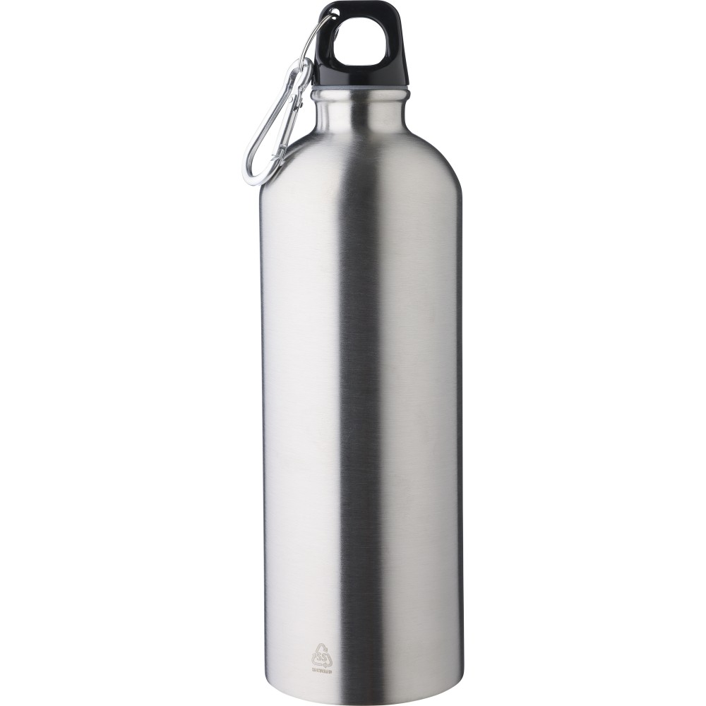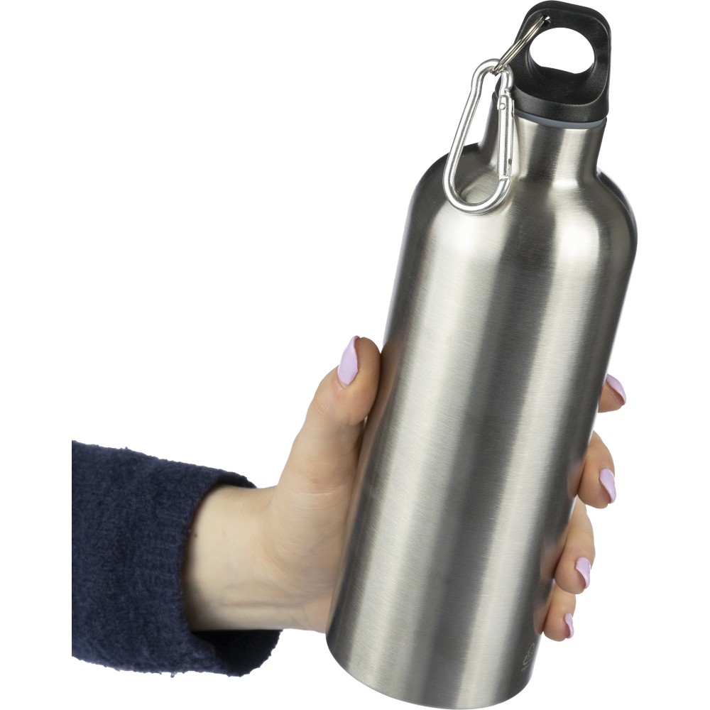 Újrahasznosított rozsdamentes acélból készült 750 ml-es szimplafalú kulacs PP kupakkal és alumínium karabinerrel. Az újrahasznosított anyagra utaló logó a palackra van gravírozva. Mosogatógépben nem tisztítható.