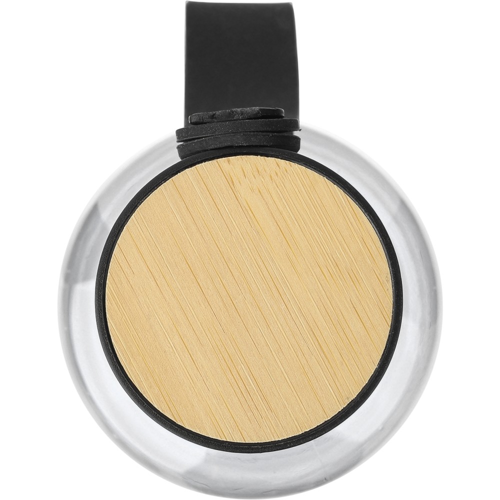 Szimplafalú rPET palack, 750 ml. PP kupakkal, melynek felső része bambuszból készült, és szilikon hordozópánttal. Mosogatógépben nem tisztítható.